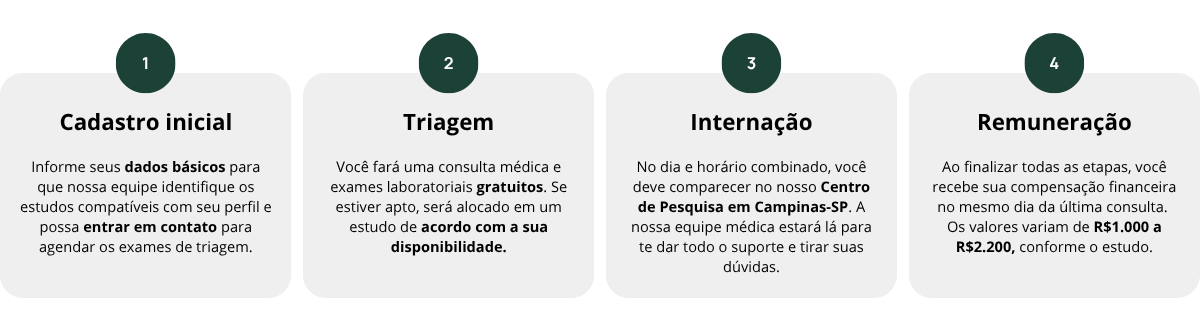 Você fará uma consulta médica e exames laboratoriais gratuitos. Se estiver apto, será alocado em um estudo de acordo com a sua disponibilidade.
