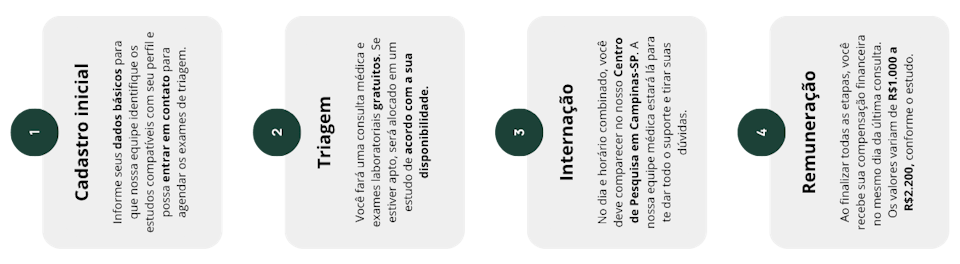 Ao finalizar todas as etapas, você recebe sua compensação financeira no mesmo dia da última consulta. Os valores variam de R$1.000 a R$2.200, conforme o estudo.